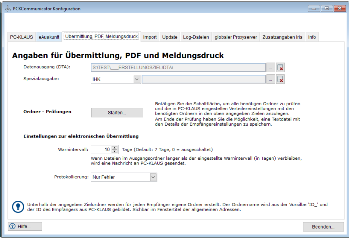 Hinweis: Alle Ausgaben erfolgen vom PCKCommunicator im aktuellen Format xGewerbeordnung und werden je Empfängereinstellung (Konfiguration Empfängereinstellungen in PC-KLAUS) in entsprechenden Unterordner der Angabe aus der Eigenschaft "Datenausgang (DTA)" gespeichert. Hinweise zum aktuellem Import- oder Exportformat Ihrer PCKCommunicator Installation entnehmen Sie bitte dem Register "Info".