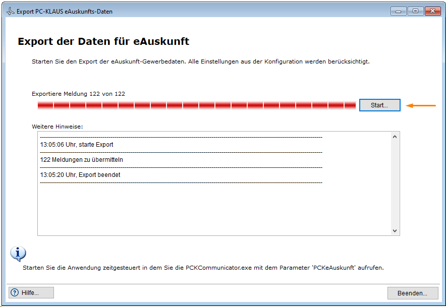 Betätigen Sie die Schaltfläche Start um den Vorgang zu starten. Der Fortschritt als auch eine Zusammenfassung der ausgegeben Daten werden ihnen wird Ihnen im Bereich Weitere Hinweise angezeigt.