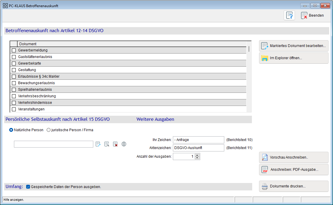Sie können - unten, in der Mitte der Maske - ein eigenes Aktenzeichen für diese DSGVO-Auskunft vergeben, das auch mit auf das Formular gedruckt wird.