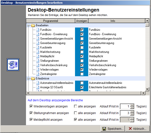 Markieren Sie im oberen Bereich den Programmteil, der in Ihrer Programmauflistung auf dem Desktop erscheinen soll. Im unterem Bereich besteht zusätzlich die Möglichkeit, die Anzeige der Bereiche Wiedervorlagen, Stellungnahmen und Aufforderung zur Meldepflicht einzuschränken, oder ganz auszublenden.