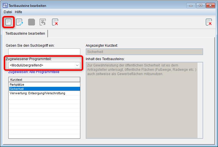 Um einen neuen Textbaustein zu erstellen, klicken Sie auf den Menüpunkt [Datei - Neu] oder auf die leere Schaltfläche zur "Neuanlage" oben links in der Schalterleiste. Der neue Textbaustein wird dann dem Programmteil zugewiesen, das in dem Drop-Down-Menü ausgewählt ist.