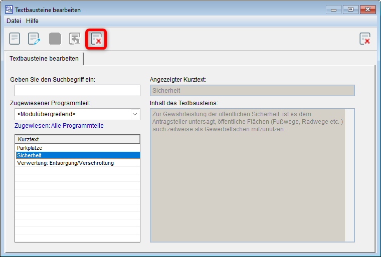 Um einen vorhandenen Textbaustein zu löschen, markieren Sie diesen mit einem Klick auf den Namen des Textbausteins in der Übersichtsliste auf der linken Seite und wählen anschließend die Schaltfläche [Löschen] in der Schalterleiste. Anschließend müssen Sie den Hinweis bestätigten, dass Sie sicher sind, den Textbaustein endgültig zu entfernen.