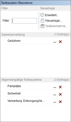 Hier werden Ihnen unter "Gewerbemeldung" die Textbausteine angezeigt, die dem jeweiligen Programmteil zugewiesen sind und weiter unten die "Allgemeingültigen Textbausteine". Mit einem Klick auf deren Namen wird der Inhalt des Textbausteines in das Textfeld eingefügt. Über die Schaltfläche [...] können Sie den Inhalt des jeweiligen Textbausteins anpassen. Mit der Schaltfläche [X] löschen Sie den Textbaustein.