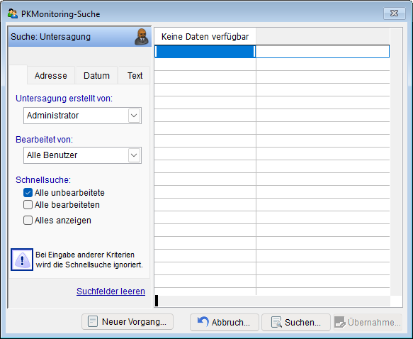 Wählen Sie die Schaltfläche [Suchen], um nach bereits angelegten Gewerbeuntersagungen zu suchen. Nach dem Start des Moduls stehen Sie auf dem ersten Registerblatt in d er Suchmaske und können mit Hilfe des Drop-Down-Menüs nach Gewerbeuntersagungen suchen, die von einem bestimmten Nutzer erstellt bzw. bearbeitet wurden. In der Rubrik Schnellsuche können Sie nach dem Status einer Gewerbeuntersagung filtern. Entfernen Sie alle eingegebenen Suchbegriffe indem Sie auf den Link "Suchfelder leeren" klicken. Wenn Sie keine Suchkriterien setzen, sucht PC-KLAUS nach allen erfassten Gewerbeuntersagungen.