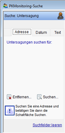 Auf dieser Seite können Sie nach Adressen suchen. Betätigen Sie den [Suchen]-Schalter und wählen Sie im Anschluss die gewünschte Adressart auf der nachfolgenden Maske (Adresse suchen). Mit dem [Entfernen]-Schalter können Sie die eingegebene Adresse auch wieder aus der Suchmaske entfernen.