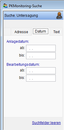 Sie können auf dieser Registerseite nach dem Anlagedatum oder dem Bearbeitungsdatum suchen. Klicken Sie in ein Datumsfeld, um mit der Tastatur ein Datum einzutragen. Mit einem Doppelklick in das Feld wird das aktuelle Datum hinterlegt. Mit einem Rechtsklick auf das Datumsfeld öffnet sich ein Kalender und Sie können sich das Datum im Kalenderdialog zusammenstellen.