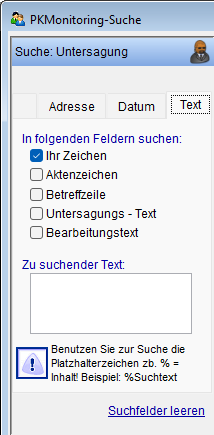 Wählen Sie die Eingabefelder aus, in denen gesucht werden soll. Anschließend können Sie den zu suchenden Text im unteren Textfeld eingeben. Wenn Sie alle Eingaben gemacht haben, betätigen Sie die Schaltfläche zum [Suchen].