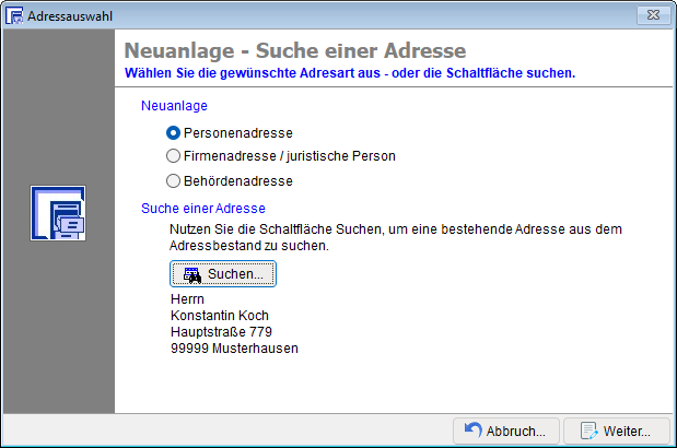 Um eine bereits vorhandene Adresse zu Übernehmen, betätigen Sie die [Suchen]-Schaltfläche. Danach gelangen Sie in die Suchmaske, um mit gewählten Suchkriterien nach bestehenden Adressen zur Übernahme zu suchen. Wenn Sie die Adresse übernommen haben, werden Ihnen die Daten unterhalb der Schaltfläche angezeigt und Sie können durch Betätigen der Schaltfläche [Weiter] den Vorgang fortsetzen. Zur Anlage oder zur Bearbeitung einer Adresse beachten Sie bitte das Kapitel Adresserfassung.