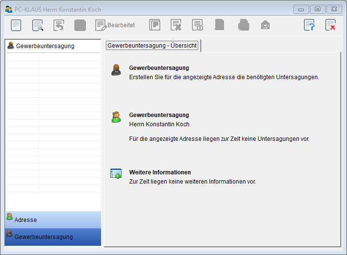 Beachten Sie: Wenn Sie eine bestehende Adresse übernehmen und bereits eine Gewerbeuntersagung zu dieser Adresse erfasst wurde, dann werden Ihnen diese Angaben auch angezeigt. In unserem Beispiel wird eine neue Gewerbeuntersagung erstellt.