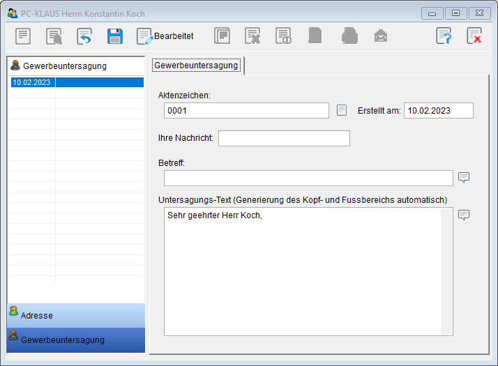 Nachdem Sie wie im vorhergehenden Schritt beschrieben eine neue Adresse angelegt oder eine bestehende Adresse übernommen haben, können SIe auf den Bereich Kurzbriefe wechseln, indem Sie links unten auf die Schaltfläche [Gewerbeuntersagung] klicken.