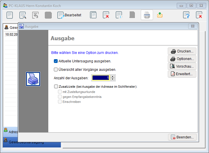 Starten Sie das Modul im Hauptmenü über den Menüpunkt [Bearbeiten]-[Gewerbeuntersagung]. Folgendes Formular wird Ihnen zur weiteren Auswahl angezeigt: