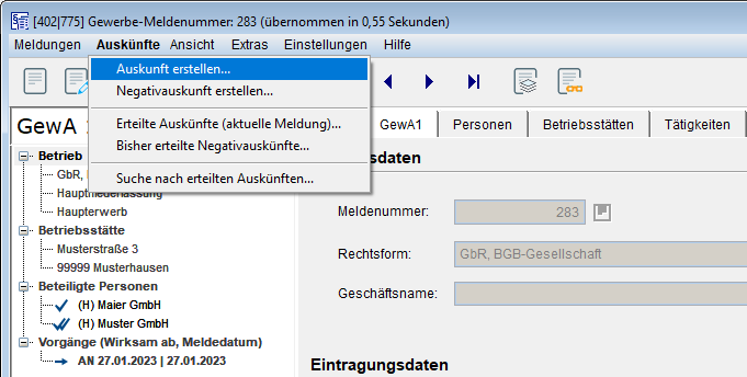 Im Anschluss wählen Sie in der Menüleiste der Gewerbemeldung den Menüpunkt [Auskünfte]-[Auskunft erstellen].