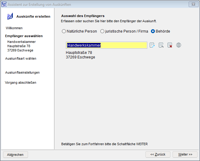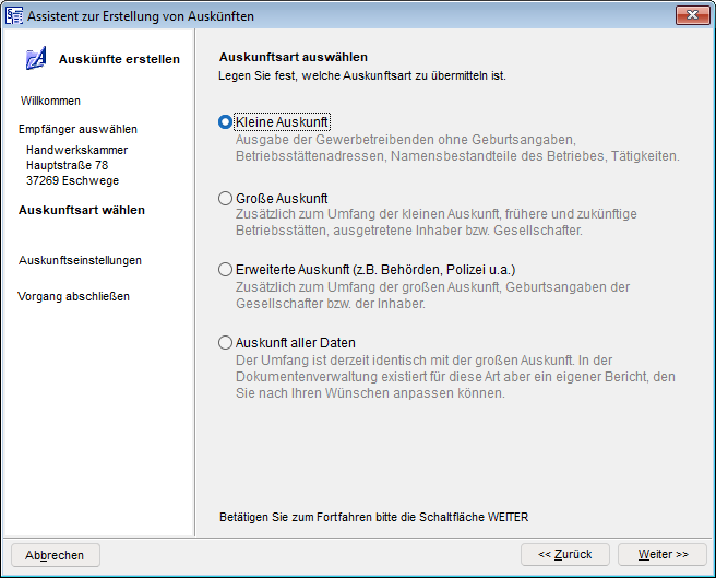Der weitere Ablauf findet auch - wie bereits oben beschrieben - in dem Assistenten für die Erstellung einer Auskunft aus dem Gewerberegister.