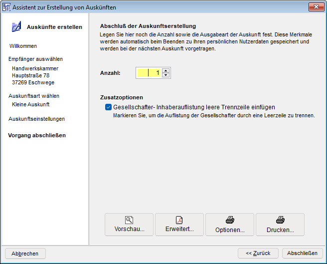 Mit der Schaltfläche [Abschließen] wird die Gewerbeauskunft gespeichert und protokolliert.