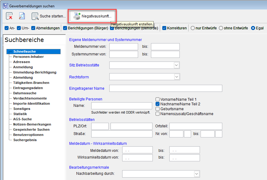 Wählen Sie dazu in der Suchmaske der Gewerbemeldung die Schaltfläche für die Erstellung einer Negativauskunft: