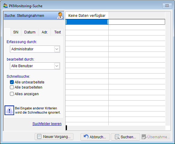Wählen Sie die Schaltfläche [Suchen], um nach bereits angelegten Stellungnahmen zu suchen. Das nachfolgend abgebildete Formular wird Ihnen zur weiteren Eingrenzung Ihrer zu suchenden Begriffe angezeigt.