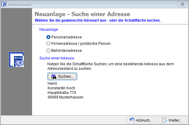 Das Suchergebnis wird Ihnen nach Übernahmen der Suche unter der [Suchen]-Schaltfläche angezeigt. Betätigen Sie zum Schluss die Schaltfläche [Weiter]. Zur Anlage oder zur Bearbeitung einer Adresse, beachten Sie das Kapitel Adresserfassung.