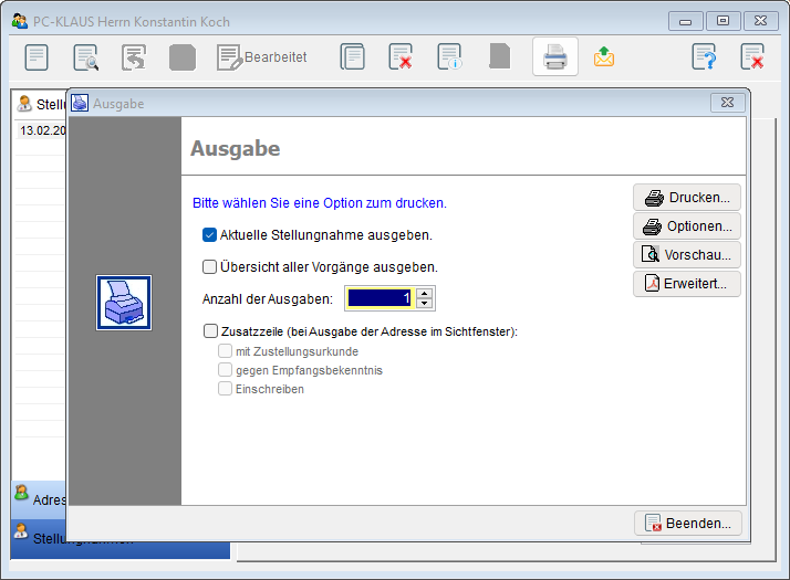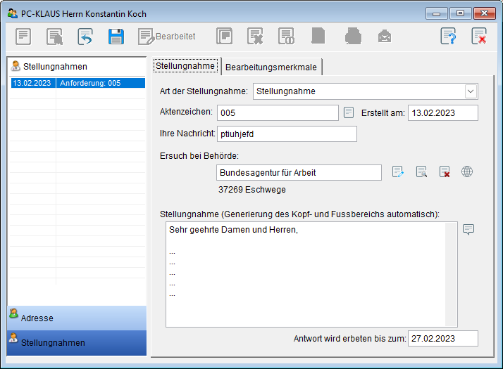 Starten Sie das Modul im Hauptmenü über den Menüpunkt [Bearbeiten]-[Stellungnahmen]. Folgendes Formular wird Ihnen zur weiteren Auswahl angezeigt: