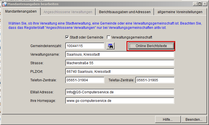 Füllen Sie dann die nachfolgenden Felder aus. Das Registerblatt "angeschlossene Verwaltungen" ist nur aktiv, wenn Sie da Merkmal "Verwaltungsgemeinschaft" markiert haben. Dann ist es möglich angeschlossene Verwaltungen die Sie mit einer eigenen Gemeindekennzahl (GKZ) mit verwalten zu erfassen.