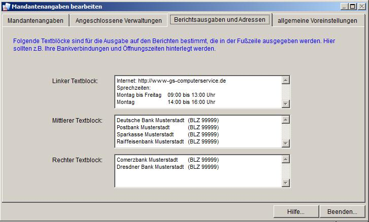 Geben Sie hier Standard-Ausgabetexte für Ihre Berichte ein. Lassen Sie die Felder leer, wenn Sie Ihre Berichte mit Hilfe der Dokumentenverwaltung anpassen.