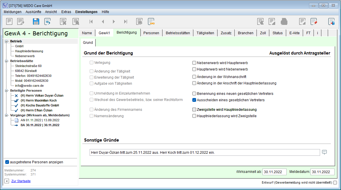 Im Ausdruck der Berichtigung wird das von Ihnen definierte Berichtigungsdatum ausgegeben. Nicht also das Austrittsdatum des Geschäftsführers. Dies ist quasi irrelevant, da der komplette Austritt auf dem Gewerbeamt eben nicht meldepflichtig ist.