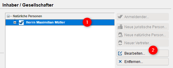 Nachdem die Berichtigungsgründe markiert wurden, wechseln Sie auf das Register [Personen] und klicken den Namen der Person an, dessen Name oder Adresse geändert werden muss. Nachdem die richtige Person blau markiert wurde, klicken Sie rechts auf die Schaltfläche [Bearbeiten].