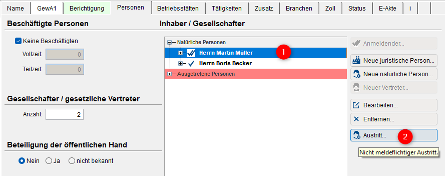 Mit Hilfe der Berichtigung können Sie auch in den Rechtsformen, bei denen der Gesellschafterein- und austritt nicht meldepflichtig ist, einen Ein- und Austritt in die Unternehmung erfassen. Markieren Sie dafür auf dem Registerblatt [Berichtigung] die zutreffenden Berichtigungsgründe (Benennung oder Ausscheiden eines gesetzlichen Vertreters) und wechseln Sie anschließend auf das Register [Personen].