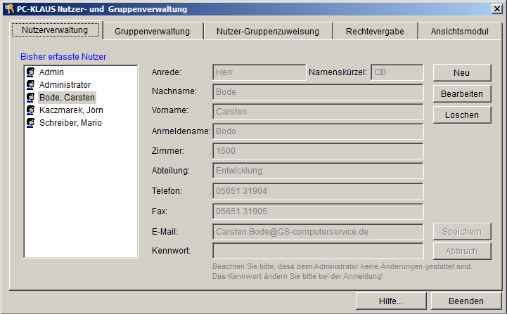 Verwalten Sie auf dieser Registerseite die Nutzer für alle Anwender, die mit PC-KLAUS arbeiten. Sie können weitere Nutzer anlegen, Nutzer bearbeiten oder aber vorhandene Nutzer löschen. Beachten Sie, dass der Nutzer „Administrator“ vom System vorgegeben ist und nicht gelöscht werden kann.