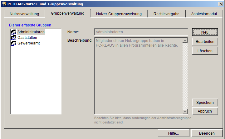 Die Gruppenverwaltung dient zur Verwaltung von Gruppen für die Nutzer-Gruppenzuweisung.