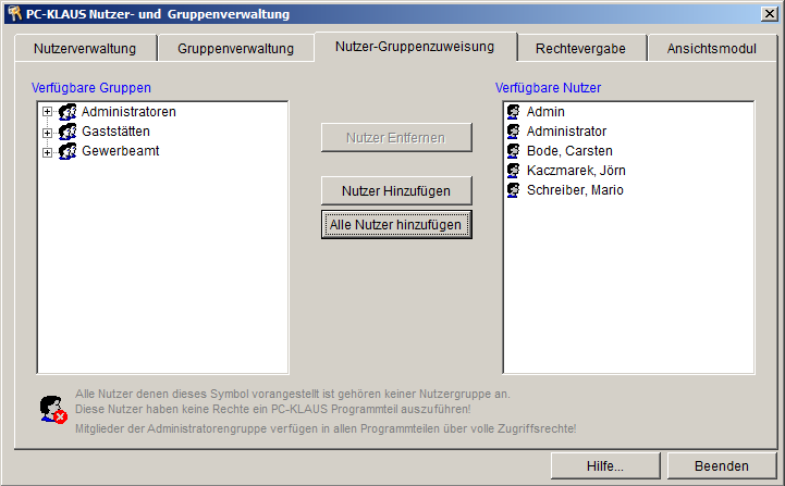 Mit dem Programmteil Nutzer- und Gruppenverwaltung können Sie den Anwendern von PC-KLAUS Rechte für die einzelnen Module zuweisen. Ein PC-KLAUS Anwender wird hierbei als Nutzer dargestellt. Dieser kann einer oder auch mehreren Gruppen zugewiesen werden. Die Vergabe der Rechte erfolgt dann ausschließlich auf die angelegten Gruppen. Jeder Nutzer sollte nur die Rechte besitzen, die er benötigt, Aufgaben erfüllen zu können. Wir möchten an dieser Stelle davon abraten, jedem Nutzer alle Rechte zu geben.