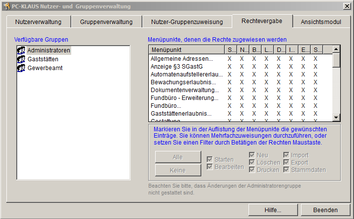 Für jedes PC-KLAUS Modul sind folgende Rechte möglich: