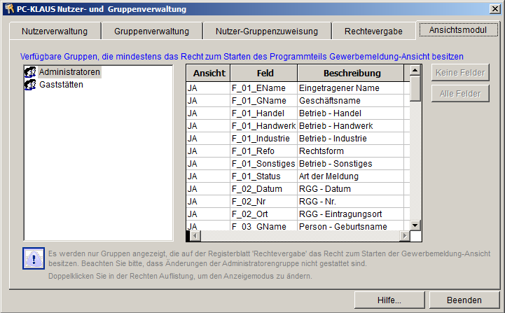 Speziell für das PC-KLAUS Gewerbe - Ansichtsmodul können Sie die Felder festlegen, welche den Anwendern zur Ansicht dargestellt werden. Auch hier erfolgt die Festlegung der verfügbaren Ansichtsfelder über die vorhandenen Gruppen.
