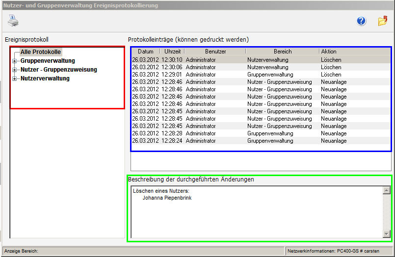 Starten Sie bitte zur Ansicht der Protokolle der Änderungen innerhalb der Nutzer- und Gruppenverwaltung das abgebildete Formular, in dem Sie auf de rot umrahmte Schaltfläche der Toolbar klicken.