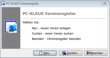 Starten Sie das Modul Vereinsregister im Hauptmenü über den Menüpunkt [Bearbeiten] [Vereinsregister]. Folgendes Formular wird Ihnen zur weiteren Auswahl angezeigt: