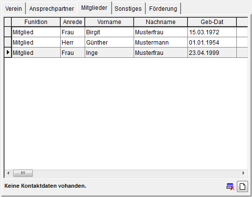 Erfassen Sie Mitglieder des Vereins direkt in der Tabelle analog zur Seite Ansprechpartner oder Importieren Sie Mitgliederlisten aus Dateien über [Extras] [Import…]. Ist ein Mitglied Ansprechpartner im Verein, wählen Sie die entsprechende Funktion aus. Nach dem nächsten Speichervorgang befindet sich die Person in der Auflistung Mitglieder.