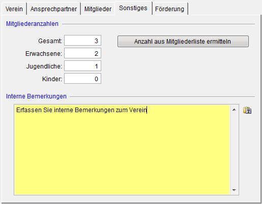 Erfassen Sie die Anzahl der Mitglieder. Mit dem Schalter [Anzahl aus Mitgliederliste ermitteln] können Sie die Gesamtanzahl aus den Anzahlen der Erwachsenen, Jugendlichen und Kinder in der Mitgliederliste automatisiert ermitteln. Erfassen Sie interne Bemerkungen zum Verein.