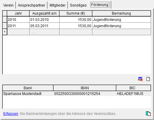 Erfassen Sie Angaben zur Vereinsförderung. Im unteren Bereich werden die Bankverbindungen des Vereins aus der Adresse des Vereinssitzes angezeigt. Die gewählte Bankverbindung kann mit dem Schalter [Kopieren] über die Zwischenablage in andere Anwendungen eingefügt werden. Wählen Sie den Link [Erfassen] um Bankverbindungen zu ändern oder neu zu erfassen. Sie finden die Bankverbindungen auf der Seite [Sonstige Firmendaten] im Abschnitt [Erlaubnisse, HWK und Bankverbindung]. Ist die Seite nicht verfügbar, können Sie die Seite über den Link [Sonstige Firmendaten bearbeiten] auf der ersten Seite einblenden. Eine ausführliche Anleitung finden Sie im Handbuch Allgemeine Adressen.