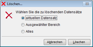 Wählen Sie, ob Sie den im Hintergrund angezeigten aktuellen Datensatz, alle Datensätze innerhalb des durch die letzte Suche ausgewählten Bereich, oder alle erfassten Datensätze löschen möchten.