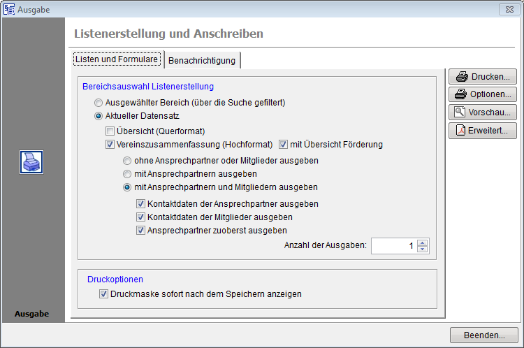 Für den Druck einer Übersichtsliste markieren Sie das Ankreuzfeld Übersicht und den gewünschten Umfang. Markieren Sie die entsprechen Felder, um die Kontaktdaten der Ansprechpartner, Mitglieder mit auszugeben. Die Option Förderung steht nur für die Vereinszusammenfassung zur Verfügung. Benötigen Sie Liste mehrfach, können Sie die Anzahl im unteren rechten Bereich festlegen. Markieren Sie, ob das Druckformular automatisiert nach jedem Speichervorgang angezeigt werden soll.