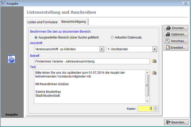 Über den Schalter [Drucken] aus der Schalterleiste, oder dem entsprechenden Menüpunkt [Datei] [Drucken] können vorhandene Listen und Benachrichtigungen ausgegeben werden.