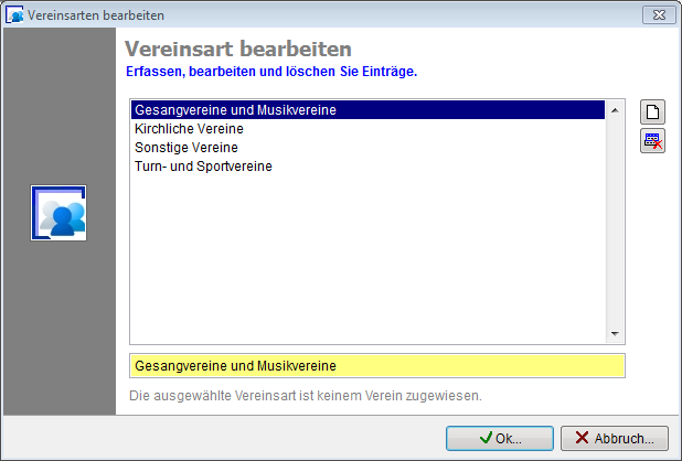 Markieren Sie im oberen Bereich einen Eintrag und führen Sie im unteren Bereich Änderungen durch. Verwenden Sie die nebenstehenden Schalter um neue Einträge zu erstellen oder gewählte Einträge zu löschen. Bestätigen Sie die Änderungen mit [OK]. Wählen Sie den Schalter [Abbruch], um die Änderungen an den Vereinsarten rückgängig zu machen.