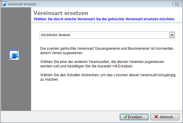 Wählen Sie die Vereinsart und bestätigen Sie mit dem Schalter [Ersetzen]. Wählen Sie den Schalter [Abbruch], um die Änderungen an den Vereinsarten rückgängig zu machen.