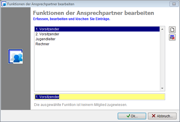 Über den Menüpunkt [Extras] [Ansprechpartner-Funktionen bearbeiten] können Sie vorhandene Funktionen für Ansprechpartner bearbeiten, neu erfassen oder entfernen. Diese Option steht nur zur Verfügung, wenn Sie den Programmteil Vereinsregister allein gestartet haben.