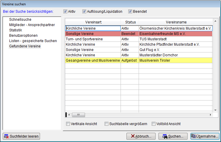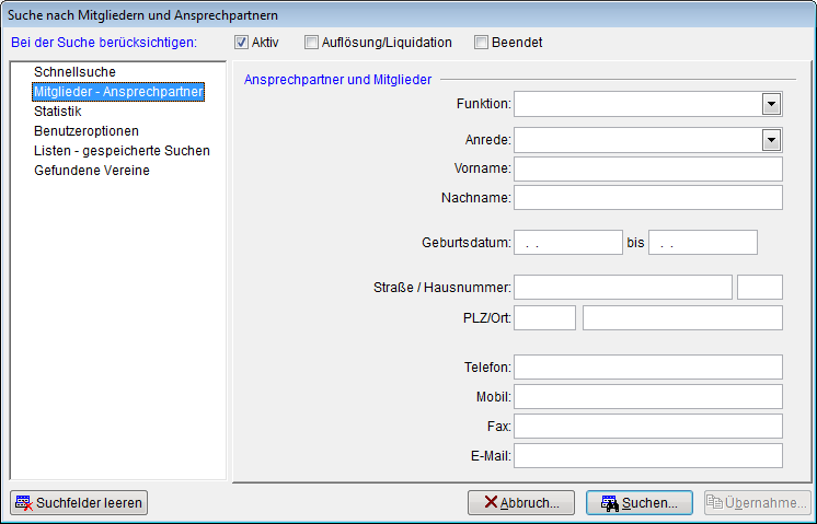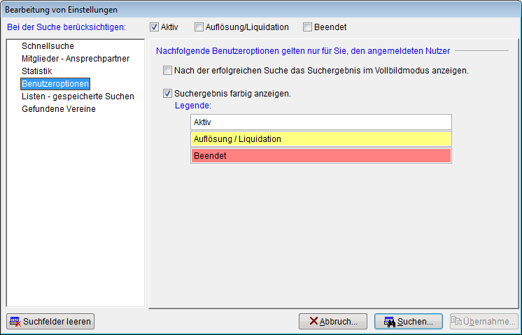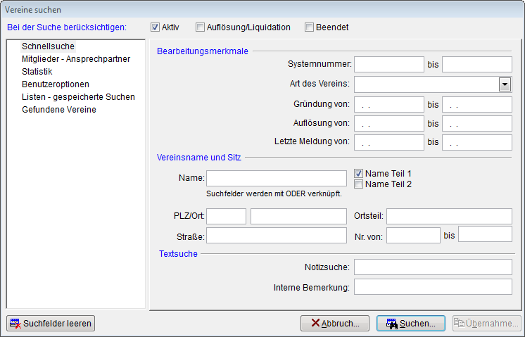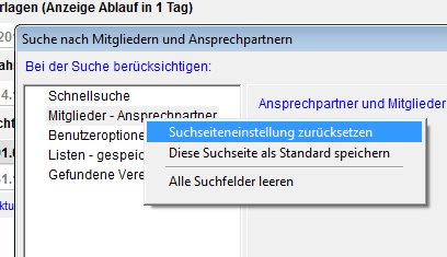 PC-KLAUS hat es sich zur Aufgabe gemacht, dass Sie nach allen Eingabekriterien und allen Kombinationen Ihre Suchen durchführen können. Sogar das Speichern immer wieder verwendeter Suchbedingungen, z.B. zur Ausgabe oder den Export in Listenform aller Vereine, wurde für Sie realisiert. Die Hauptseite, die Ihnen nach dem Start des Formulars angezeigt wird, ist die Schnellsuche. Hier haben wir die Suchbegriffe hinterlegt, die erfahrungsgemäß am häufigsten verwendet werden. Möchten Sie eine andere Standard-Suchseite beim Starten des Suchformulars, dann betätigen Sie bitte in der Auflistung der Suchbereiche die rechte Maustaste.