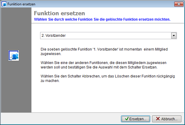 Wurde eine gelöschte Funktion bereits verwendet, erscheint ein zusätzliches Formular in dem Sie eine Funktion auswählen können, durch die die bisherige Funktion ersetzt werden soll.