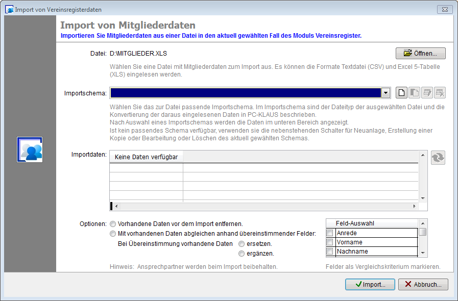Über den Menüpunkt [Extras] [Import] können Mitgliederdaten für den aktuell gewählten Verein importieren.