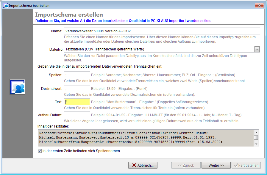 Wählen Sie den Namen für das Schema. Hier bietet sich die Herkunft (Programm und/oder Verein) der Datei an. Wählen Sie den Dateityp. Es stehen Microsoft Excel 5-Tabelle und CSV – also Trennzeichen getrennter Text an. Der untere Bereich ändert sich je nach gewähltem Dateityp. Für den Dateityp Excel 5 können Sie optional ein zu importieren des Arbeitsblatt angeben. Dies ist nicht notwendig, wenn die erste Seite einer Arbeitsmappe importiert werden soll. Befinden sich in der ersten Zeile der Tabelle Spaltennamen, markieren Sie das entsprechende Feld.