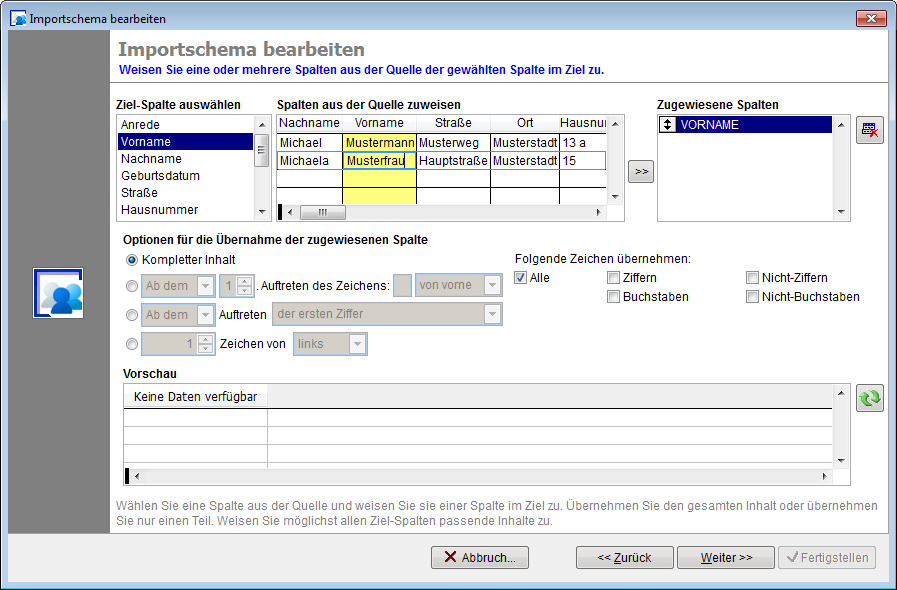 Weisen Sie möglichst allen Ziel-Spalten Spalten aus Quell-Datei zu. Wählen Sie hierzu die entsprechende Ziel-Spalte im linken Listenfeld und weisen Sie aus der Tabelle mittels Doppelklick in die Tabelle eine Spalte zu. Sie können eine oder mehrere Spalten zuweisen. Für die Übernahme der Daten aus der Spalte können Sie im unteren Bereich jeweils Optionen festlegen. Sie können den kompletten Inhalt oder nur einen Teil übernehmen oder die zu übernehmenden Zeichen auf Ziffern, Buchstaben, Nicht-Ziffern oder Nicht-Buchstaben beschränken. Im unteren Bereich können Sie eine Voransicht mit den aktuellen Einstellungen anzeigen.
