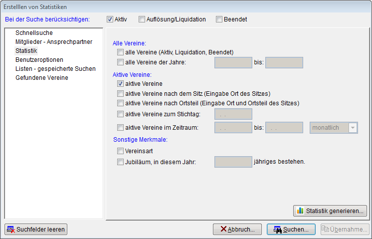 Die Seite Statistik funktioniert unabhängig von der restlichen Suche. Markieren Sie die gewünschte Statistik und betätigen Sie den Schalter [Statistik generieren].