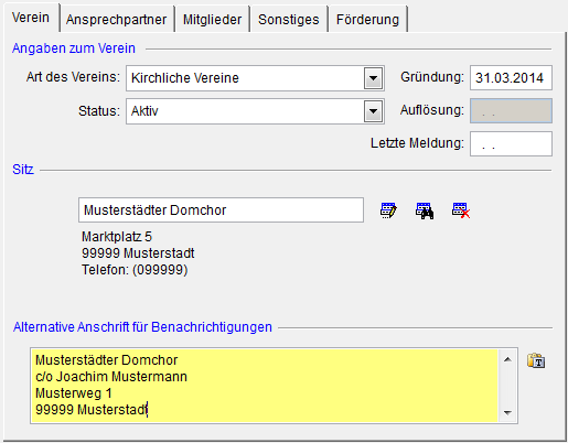 Wählen Sie die Art des Vereins. Sie können die zur Auswahl stehenden Einträge über [Extras] [Vereinsarten bearbeiten…] anpassen. Erfassen Sie den Status des Vereins. Erfassen Sie das Gründungsdatum. Das Auflösungsdatum können Sie nur bei gewähltem Status Auflösung/Liquidation oder Beendet erfassen. Tragen im Datum der letzten Meldung ein, wann Ihnen zuletzt aktuelle Daten gemeldet wurden. Sie können wie bei jeder Datumserfassung einen [Doppelklick] verwenden, um das aktuelle Datum zu übernehmen oder mit der [rechten Maustaste] das Datum aus einem Kalender auswählen. Erfassen Sie den Sitz des Vereins. Beachten Sie dazu bitte das Kapitel Adresserfassung. Erfassen Sie – falls erforderlich – eine alternative Anschrift für den Verein.